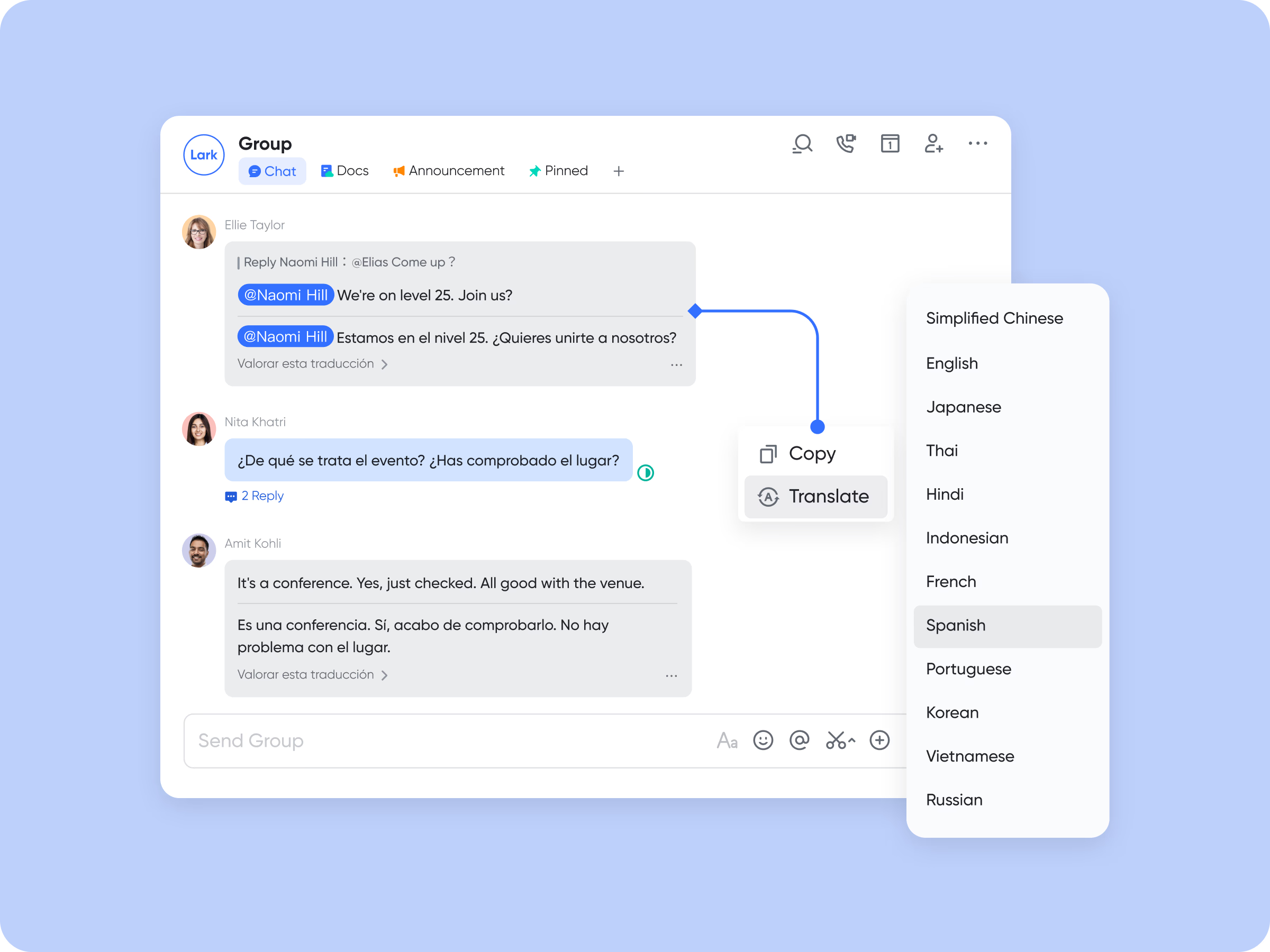 - Remote and hybrid work enablement: As remote and hybrid work become increasingly common, a unified platform is key to maintaining seamless collaboration. Lark offers built-in video meetings (Lark Meeting) and cross-platform chat (web, desktop, mobile), ensuring connectivity anytime, anywhere. All documents and conversations are cloud-synced, allowing remote employees to stay continuously updated. Notably, the built-in auto-translation feature enables smooth communication for global teams. As a result, geographical distance becomes less of a barrier: data and communication channels are centralized within Lark, enabling faster decision-making and execution regardless of where employees are located.