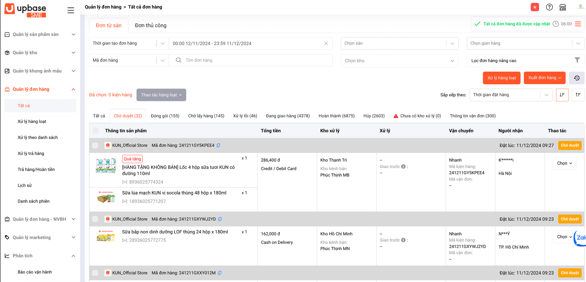 - Orders from Shopee, Lazada, and TikTok Shop were synchronized into a single interface, updated in real time, making it easy for Phuc Thinh to monitor and process them efficiently.