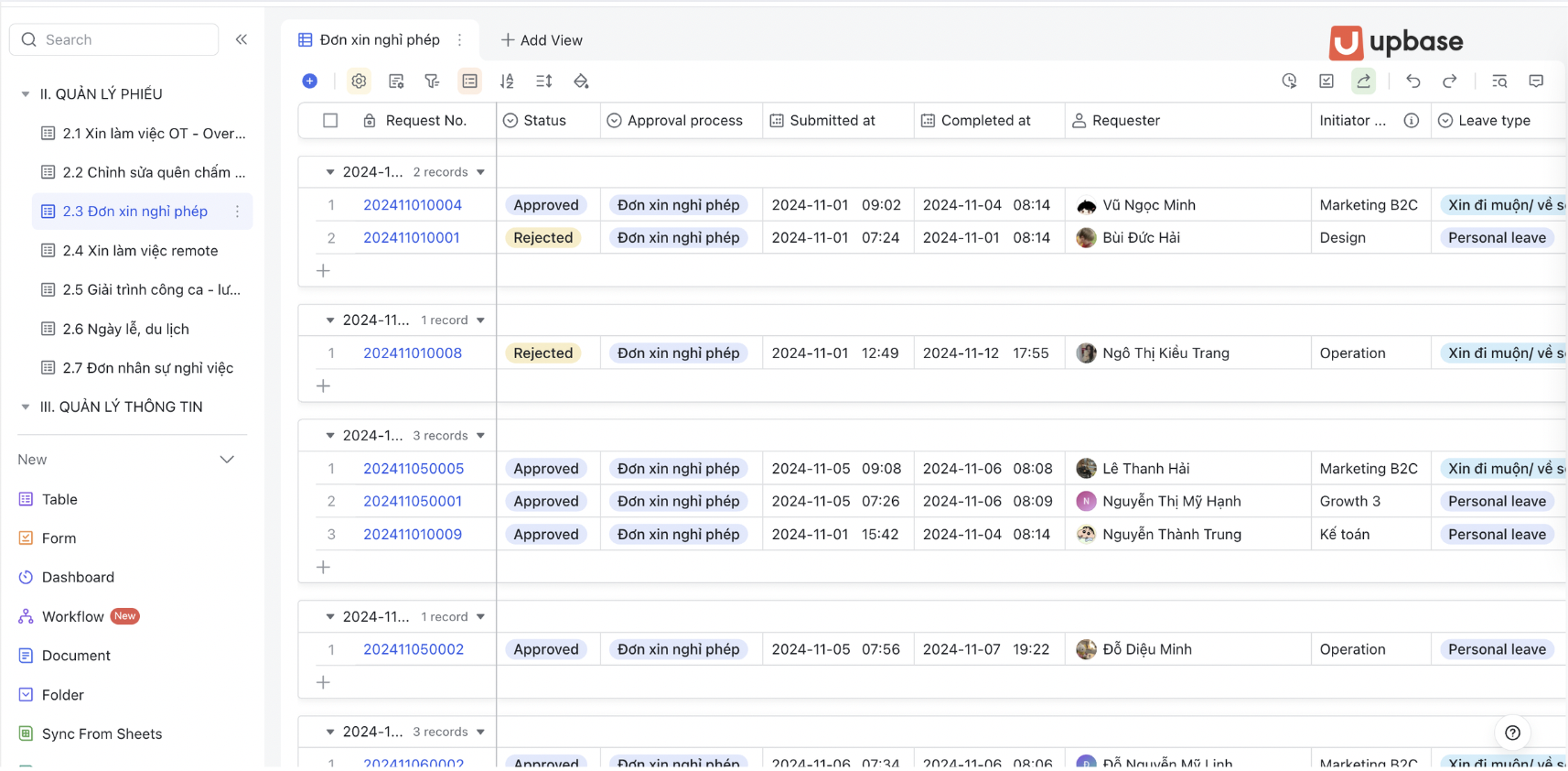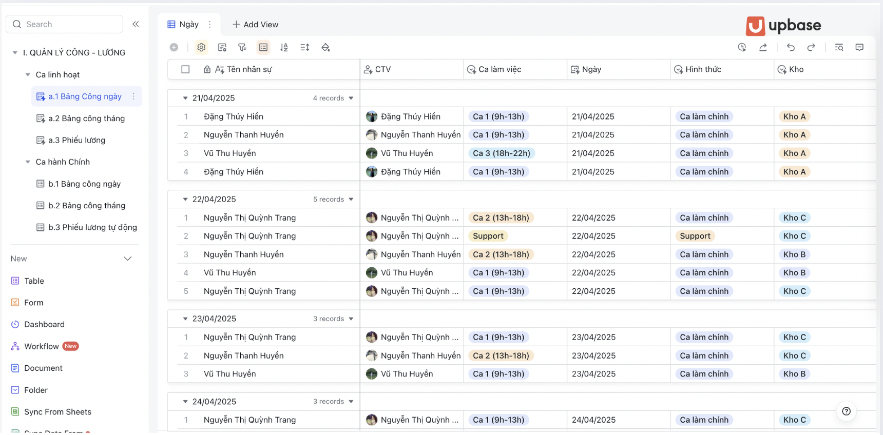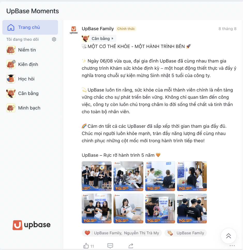 Không chỉ dừng ở lý thuyết, UpBase mang đến cho doanh nghiệp một hệ thống vận hành HRM số hóa toàn diện, được thiết kế và tùy chỉnh theo nhu cầu thực tế. Dưới đây là loạt hình ảnh demo trực quan về giao diện, tính năng và quy trình triển khai tại chính UpBase, giúp bạn hình dung rõ ràng cách Lark và UpBase đồng hành trong việc quản lý vòng đời nhân sự, từ chấm công - tính lương - phê duyệt, cho tới đào tạo và truyền thông nội bộ.