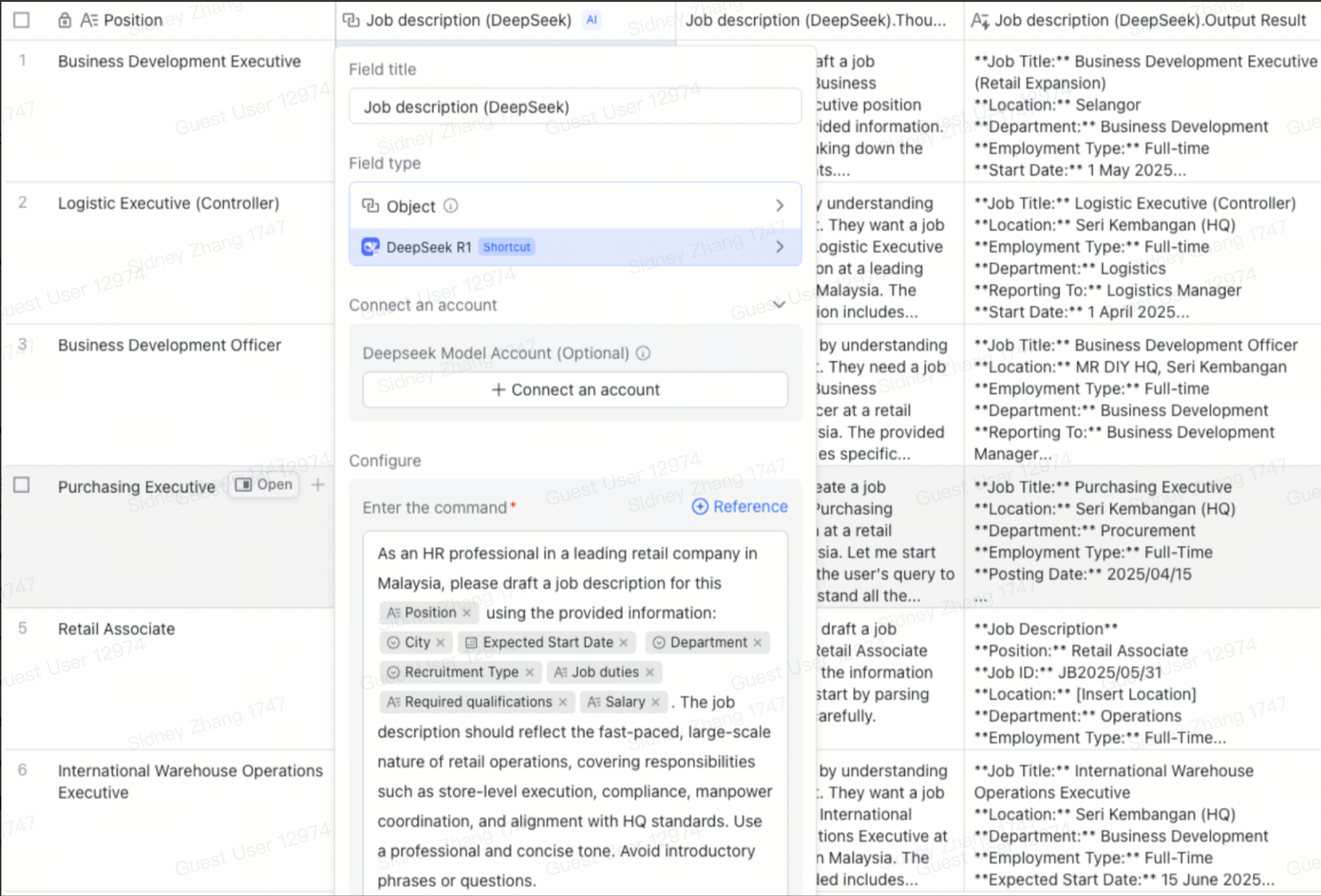 - LLMs (DeepSeek, ChatGPT tích hợp Lark Base): phân tích nội dung, tổng hợp dữ liệu, sinh báo cáo HR tự động.