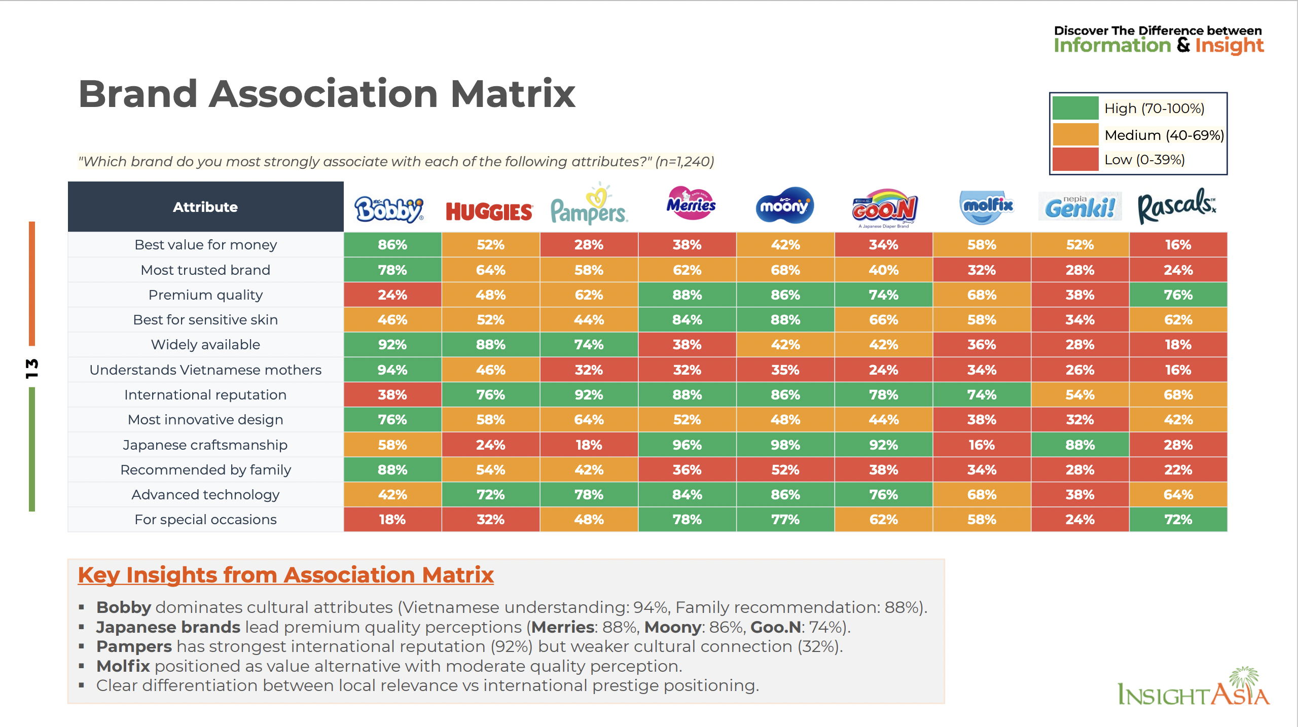 Nhìn vào ma trận liên tưởng thương hiệu (Brand Association Matrix), chúng ta thấy một thực tế khốc liệt: Trong khi các nhãn hàng Nhật/Mỹ đã chiếm lĩnh hoàn toàn các từ khóa về "Chất lượng cao cấp" hay "Công nghệ tiên tiến", thì các thương hiệu mới hoặc thương hiệu ngách rất dễ bị mờ nhạt nếu chỉ tập trung vào các thuộc tính lý tính tương tự.