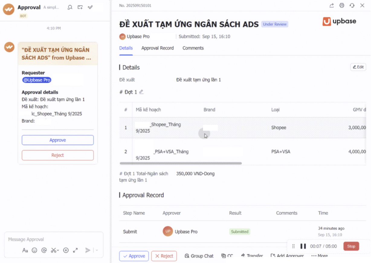 Khi campaign đang tốt và cần thêm ngân sách, Digital Ads gửi đề xuất bổ sung trực tiếp trên hệ thống kèm dữ liệu performance thực tế làm căn cứ. Người duyệt nhận thông báo tức thì, phê duyệt trên hệ thống, và ngân sách được cập nhật ngay vào dòng của brand đó. Lịch sử phê duyệt, timestamp và người duyệt đều được lưu lại tự động.
