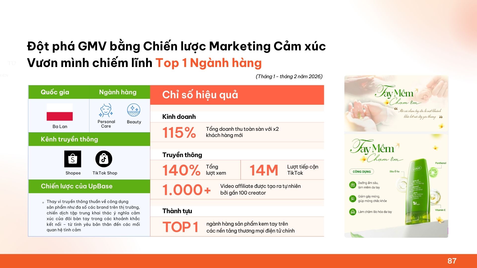Ngoài ra, UpBase cũng mang tới chiến lược truyền thông đa kênh, cộng hưởng đa nền tảng: Lấy TikTok (TikTok Video & TikTok Shop) làm điểm phát động, khuếch đại thông điệp và tạo lực kéo ban đầu; đồng thời dẫn dắt dòng traffic về Shopee và Facebook để chốt đơn và remarketing. Tất cả được vận hành như một hệ sinh thái thống nhất, giúp mở rộng độ phủ, gia tăng tần suất chạm, tối đa hoá chuyển đổi trên mọi điểm chạm.